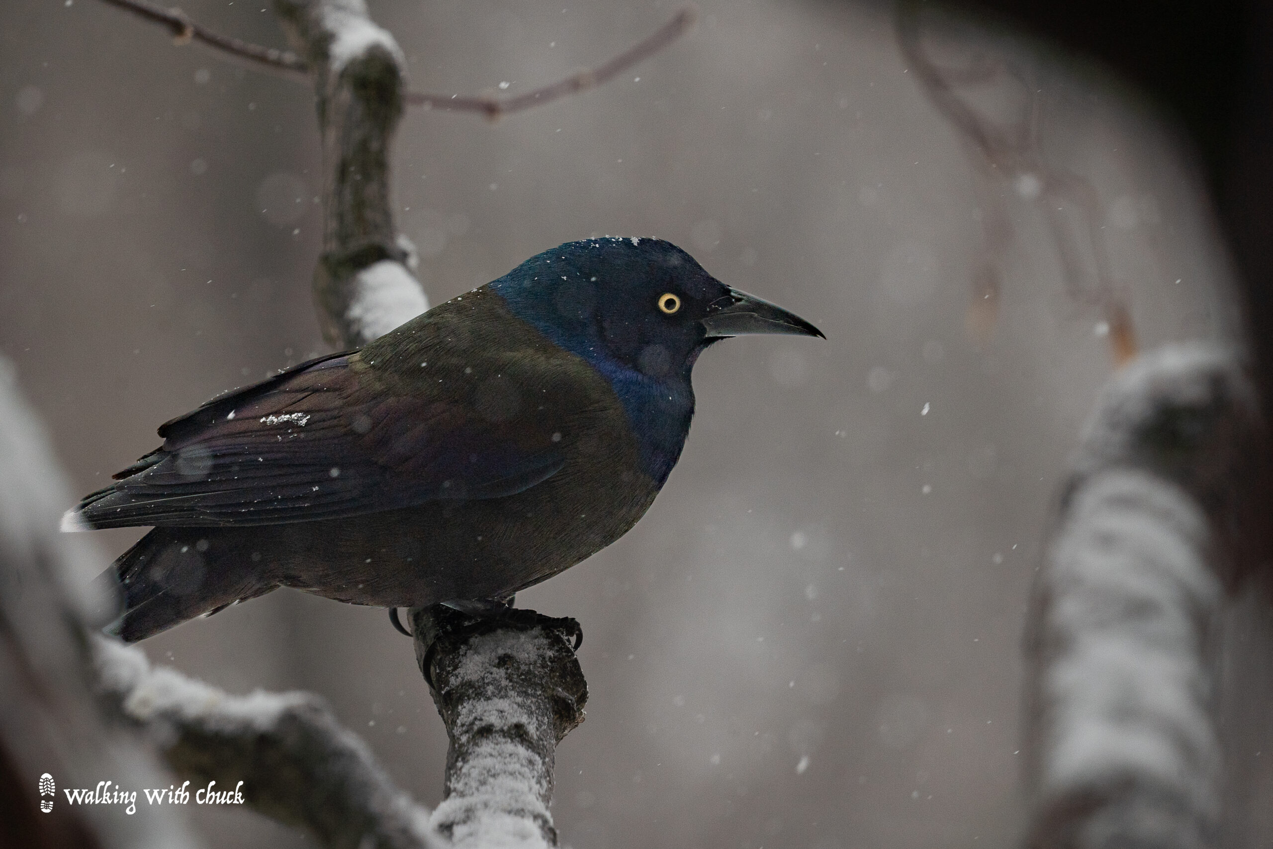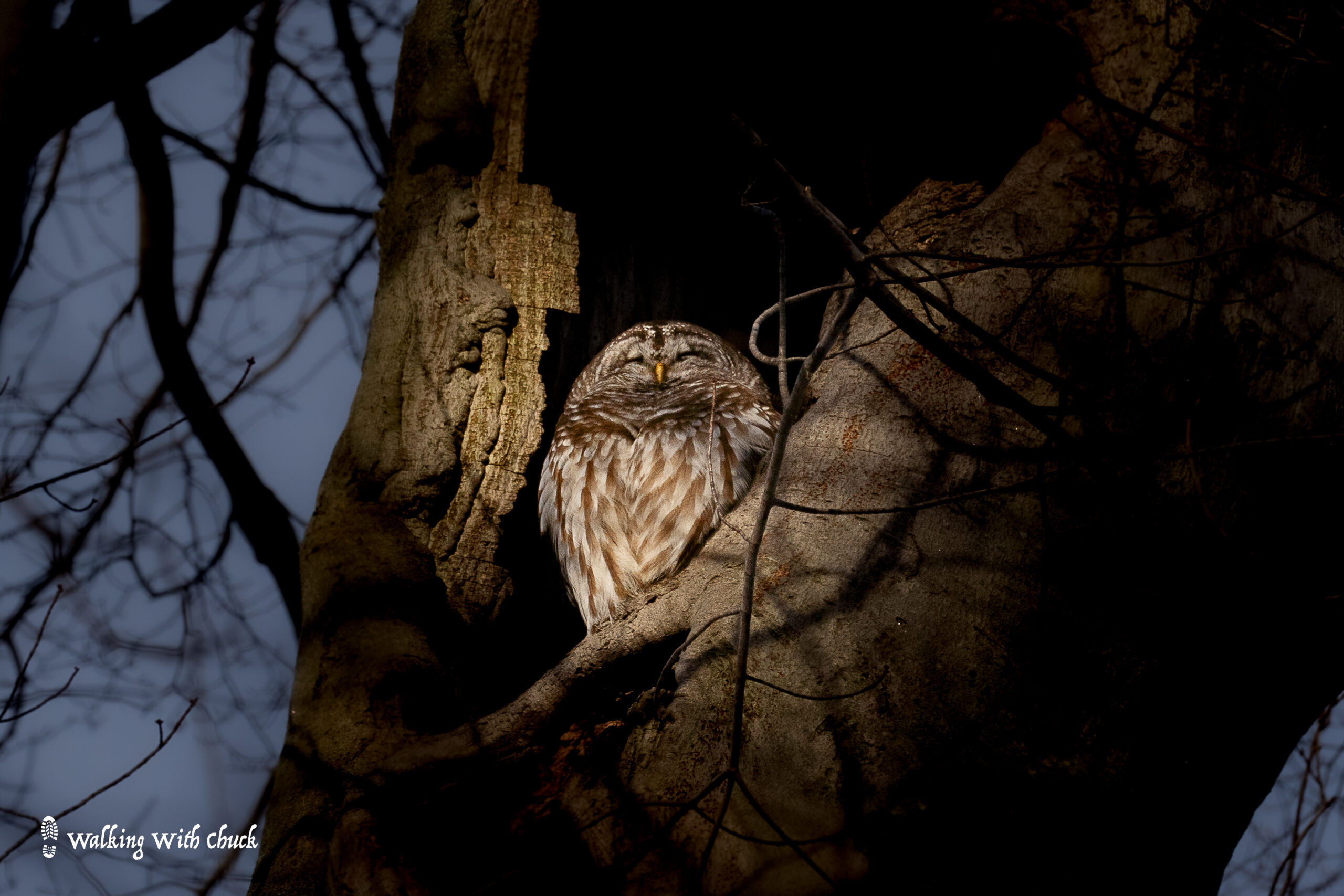 Sunday, we visited a nearby pond. I hoped that maybe a clear patch of water there would draw some ducks and geese or maybe, if luck was on our side, a swan. But the pond was frozen solid. We turned away from the water and headed into the woods. A squirrel darted by. I heard the unmistakable rapping of a pileated woodpecker somewhere in the forest, but I couldn’t locate it. We turned and started back when I glanced up at a nook in a tree. I couldn’t be sure, but I thought there might be something in it. I fished my phone out of my pocket and zoomed in. There, eyes closed, sat a beautiful barred owl! Its feathers were puffed out against the cold. I made my way closer, looking for a clear view through the tangle of branches between us. Careful not to get too near, I finally found a good view. I stood for a long time watching it sleep and admiring its camouflage before I tugged at Chuck’s leash and we moved away through the snowy woods.