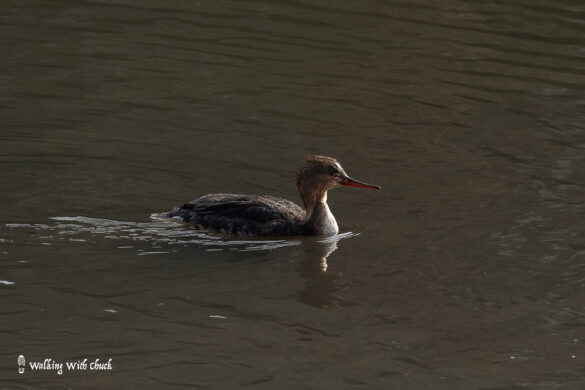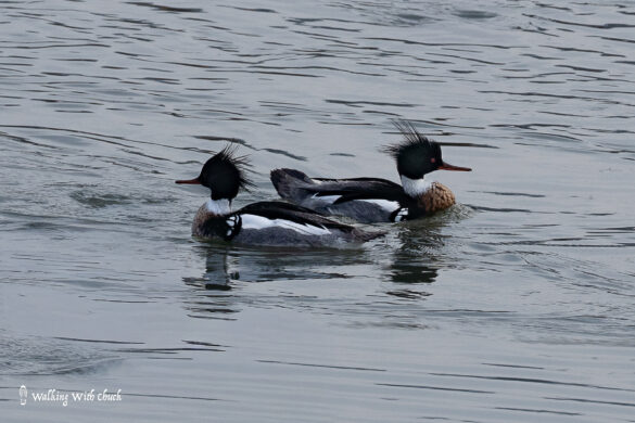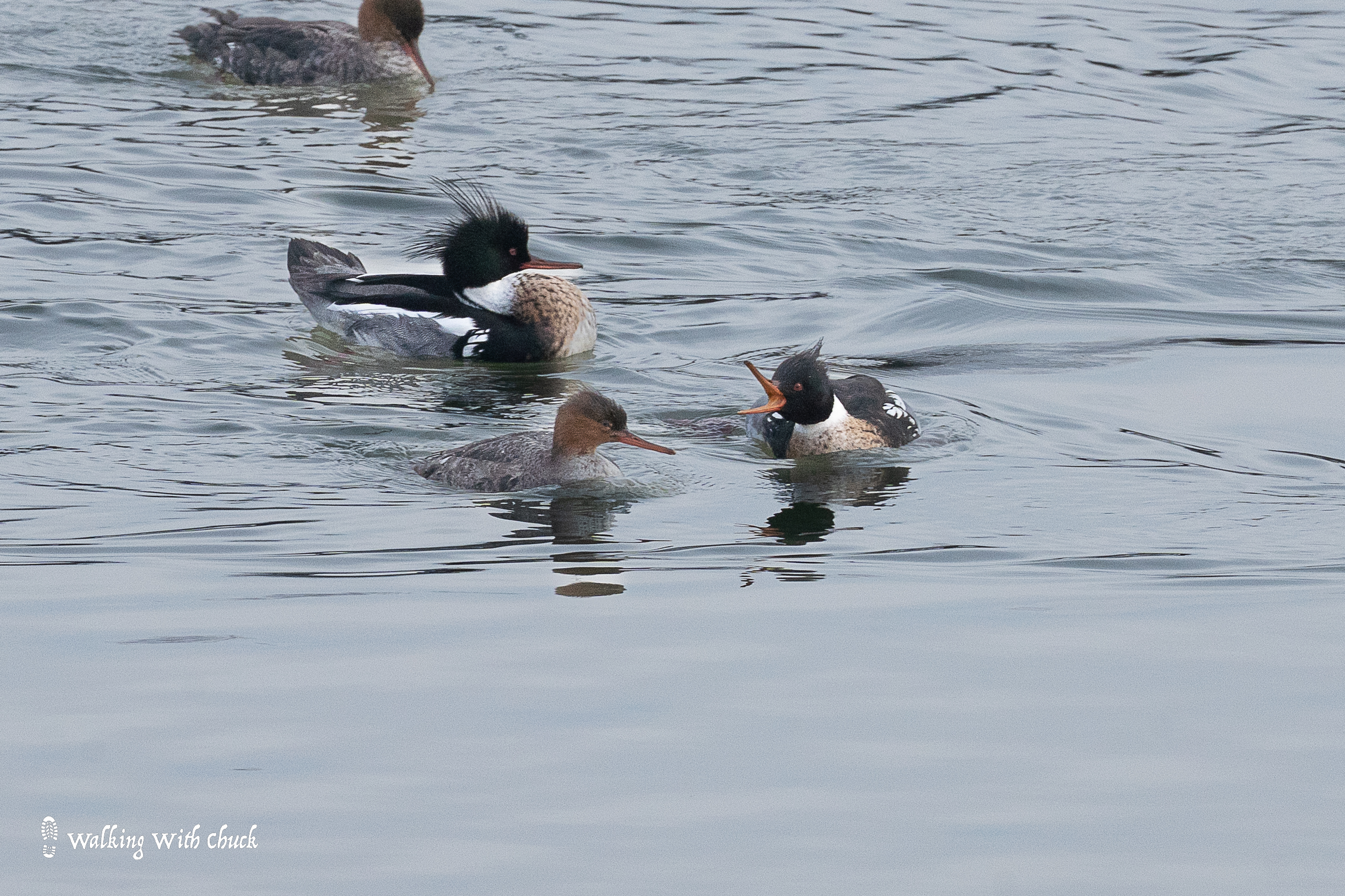 The river was busy with gulls and geese and ducks of all sorts. They swam and fluttered and clucked and chattered. I was thrilled to see flocks of mergansers chasing each other here and there. A lone redhead looked for friends first among the mergansers and then among the mallards before settling in amongst the gulls.