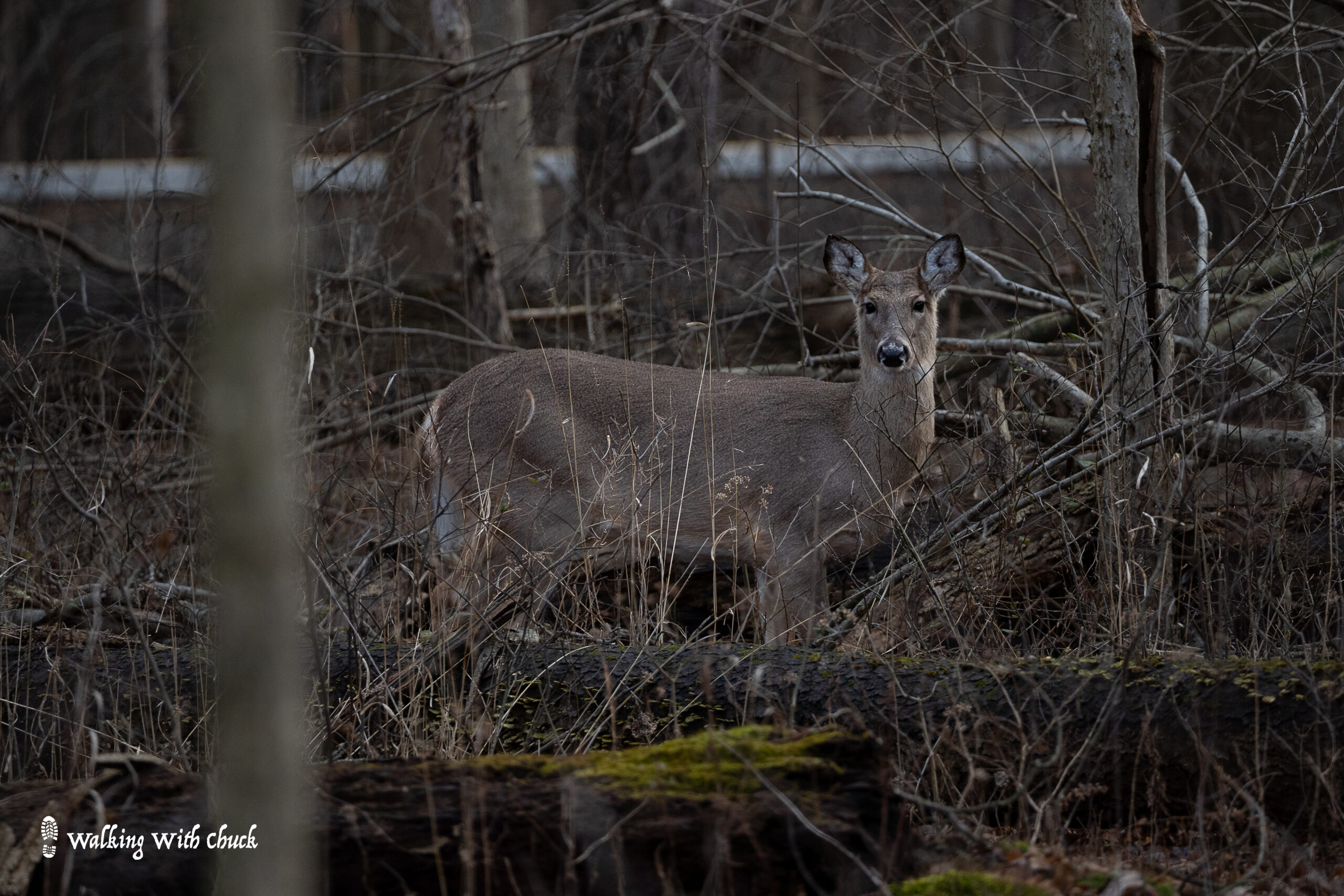 Deer root around in the deep snow looking for tender grass. As we approach, their heads pop up and they stare. Little piles of snow perch on their black noses and they blink comically. Some take shelter in the naked woods. They nestle into drifts of snow. It’s hard to see them until one moves and then, as I look closer, I see an entire herd. They are not alarmed.