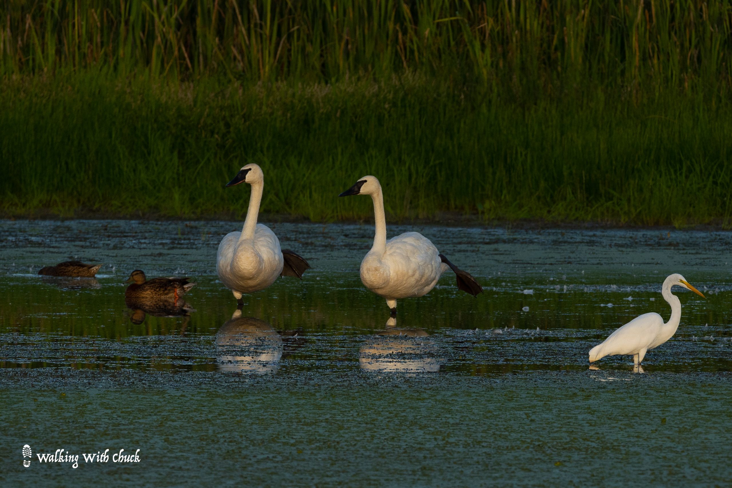 At the back of the field is a restored wetland area. As we approached the ponds, I was thrilled to see a pair of swans, a little flock of ducks and an egret all gathered in the shallow water. Each of the swans held a giant webbed foot out of the water – it was like they were doing yoga in the park.