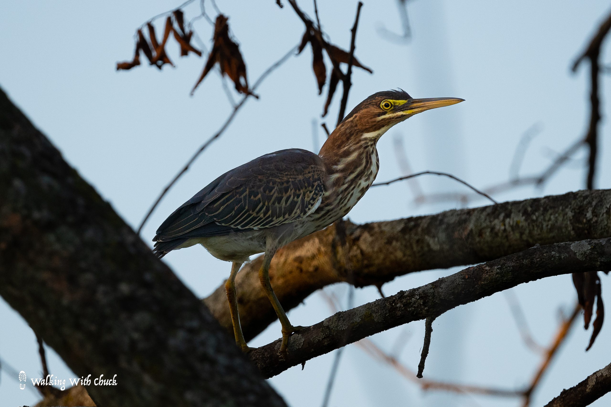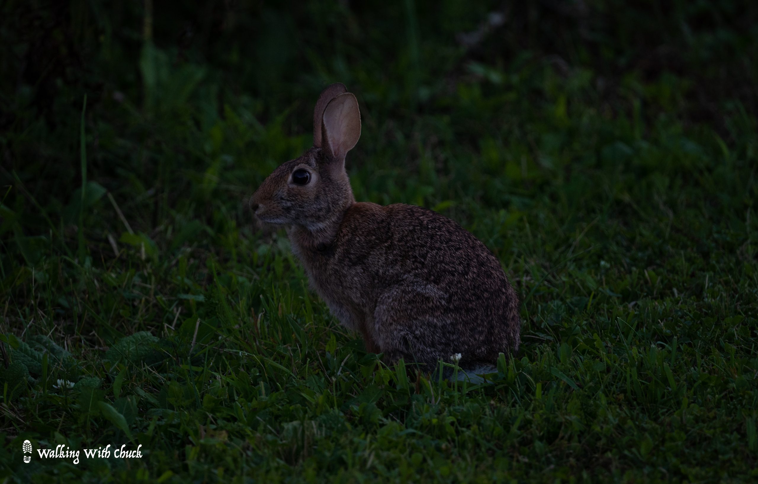 We moved around the pond to try to get closer to the swans. To our left, I heard a rustle and spotted a young green heron perched in a tree. He was gawky and nervous, but curious enough to hang around and let us approach. The sun had slipped below the trees and the light was growing dim. I spotted a goldfinch just near the trail; his yellow feathers seemed to glow in the evening light. On the ground, a rabbit stood frozen at the edge of the path.