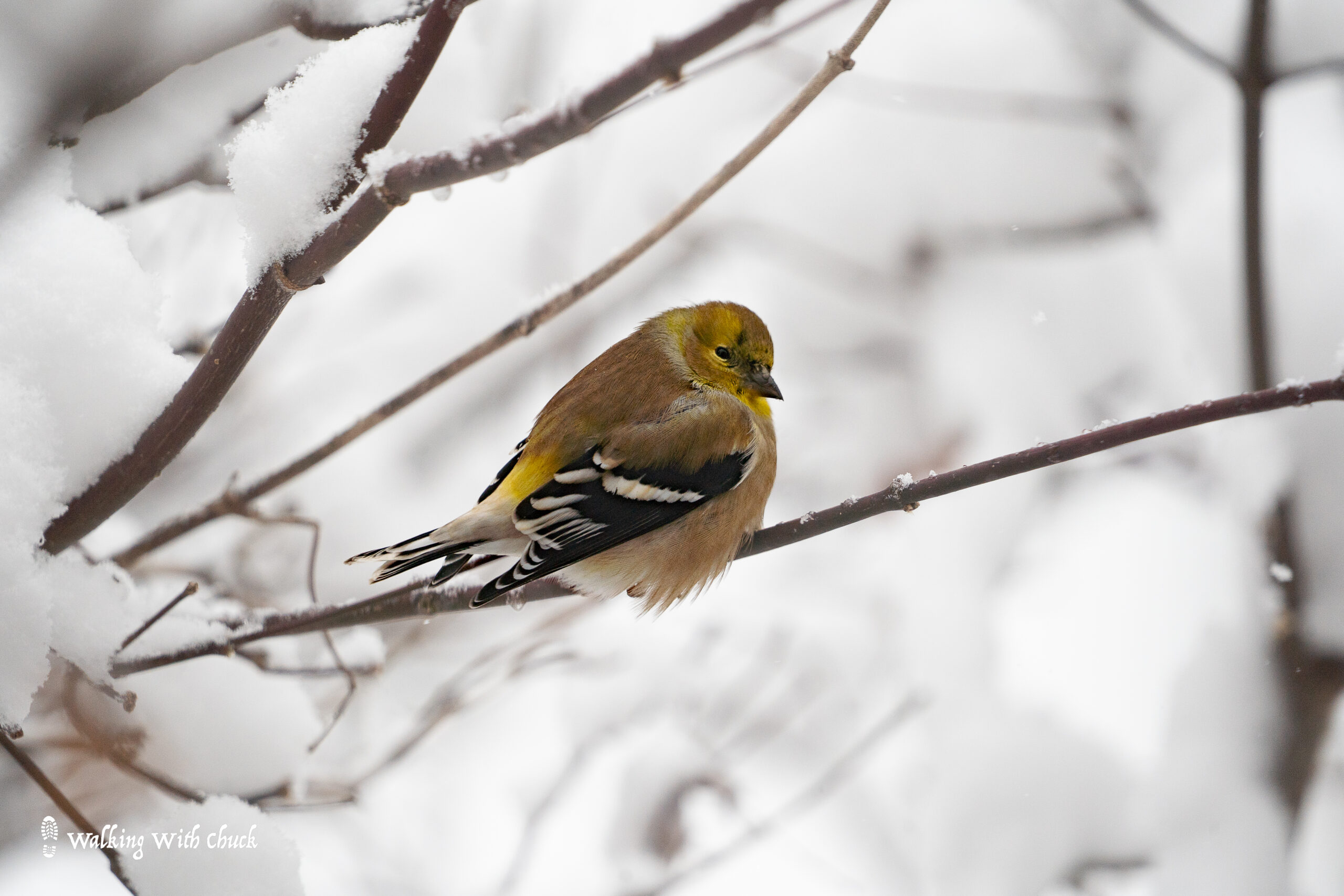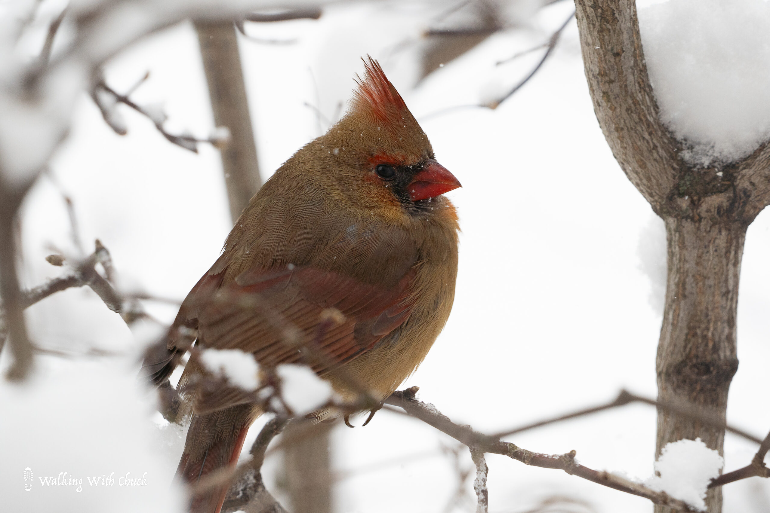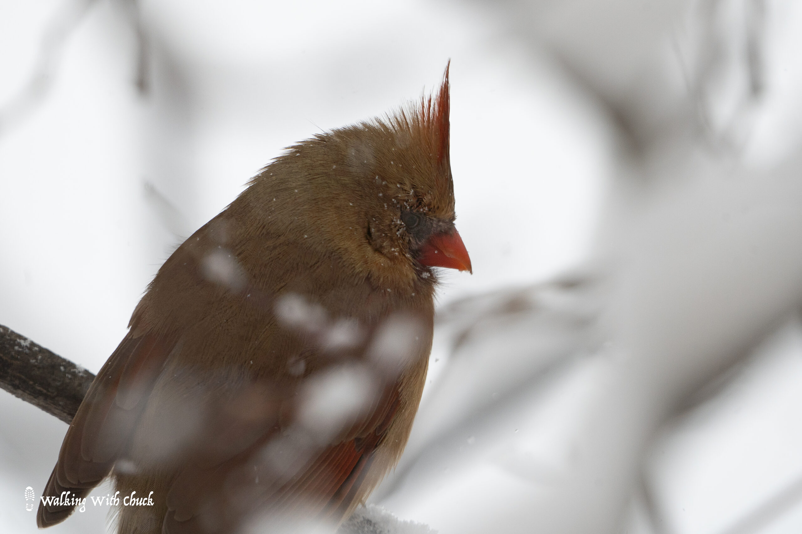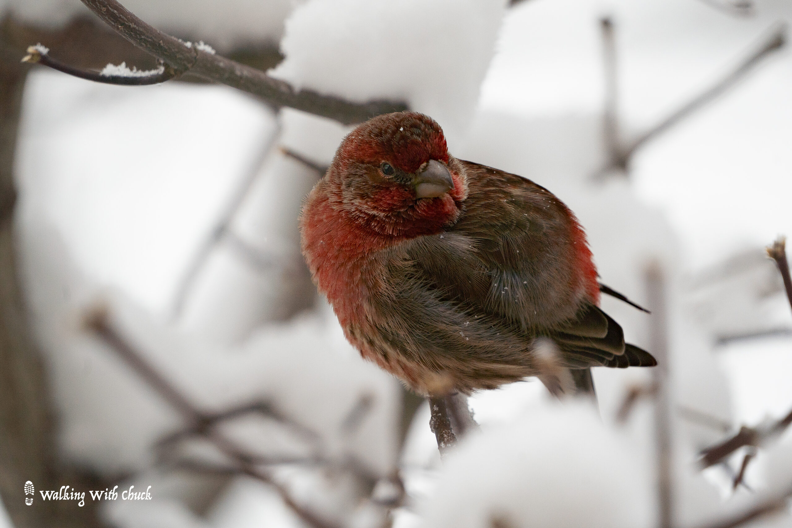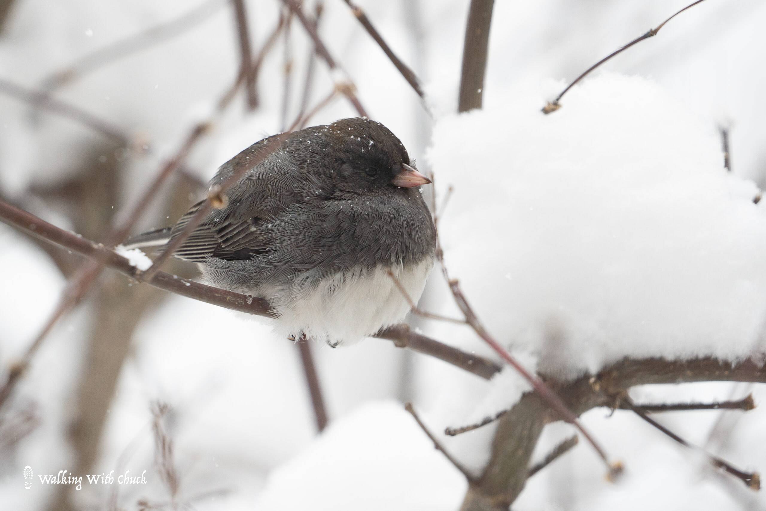 When snow falls heavy, it frosts the trees and blankets the ground with glorious white powder. Big flakes drift in the wind. My little bird friends fluff themselves out. They tuck their heads into their feathers. As they move from tree to tree, they knock little clumps of snow off of branches and leave delicate prints wherever their tiny feet touch. They gather together as if just being near one another gives them comfort in the snow. They don’t sing or chirp, they just squint at me as snow collects on their backs and beaks.