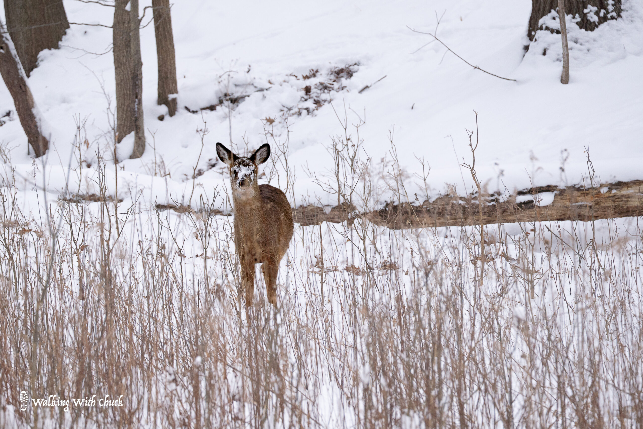 Deer root around in the deep snow looking for tender grass. As we approach, their heads pop up and they stare. Little piles of snow perch on their black noses and they blink comically. Some take shelter in the naked woods. They nestle into drifts of snow. It’s hard to see them until one moves and then, as I look closer, I see an entire herd. They are not alarmed.